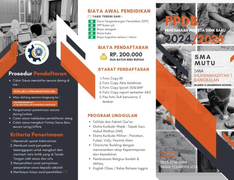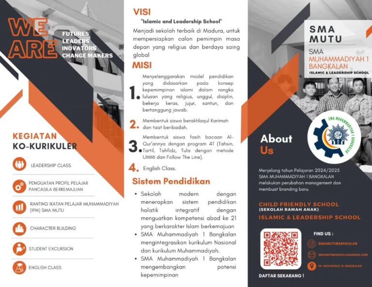 “Bergabunglah dengan SMA Muhammadiyah 1 Bangkalan dan jadilah bagian dari lingkungan pendidikan yang unggul, berkarakter islami, dan berprestasi. Dapatkan pengalaman belajar yang inspiratif dengan pendampingan guru yang profesional dan fasilitas pendukung untuk mengembangkan potensi terbaikmu.”