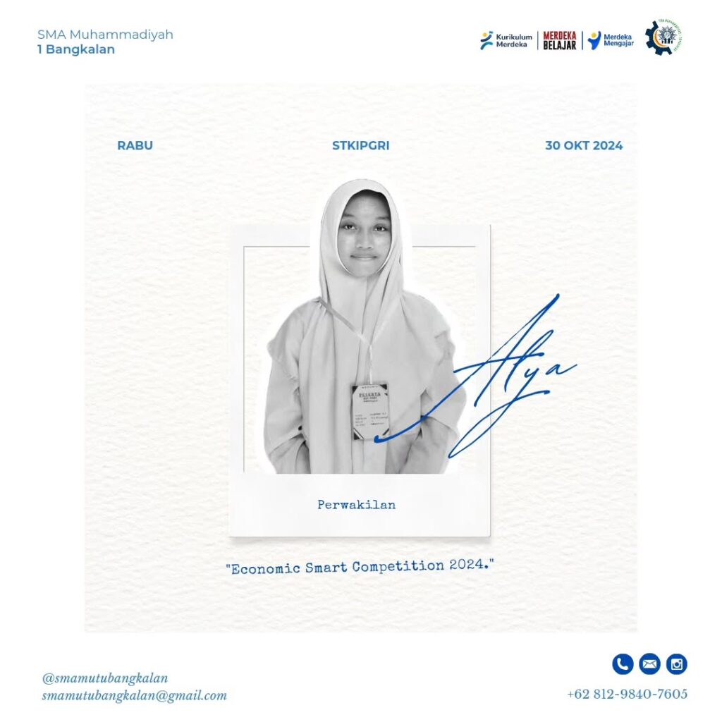 Alyandra Maulidavieska menjadi perwakilan dari sekolah SMA Muhammadiyah 1 Bangkalan dalam Economic Smart Competition 2024 yang diadakan oleh HIMEK 2024 di Kampus STKIP PGRI BANGKALAN pada tanggal Rabu, 30 Oktober 2024.