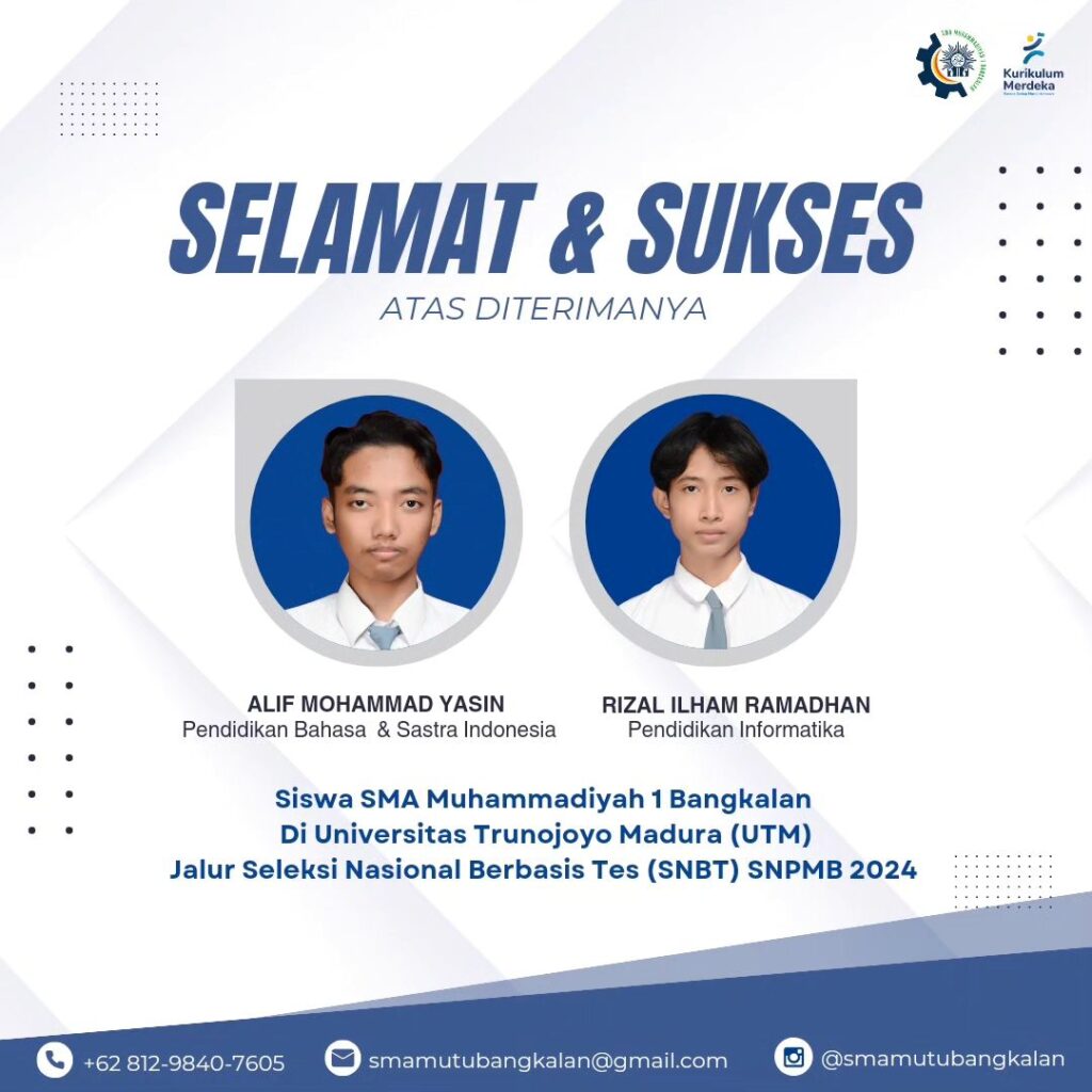 Selamat dan Sukses kami ucapkan kepada Siswa SMA Muhammadiyah 1 Bangkalan Atas diterimanya Di Universitas Trunojoyo Madura Jalur Seleksi Nasional Tes (SNBT) SNPMB 2024.